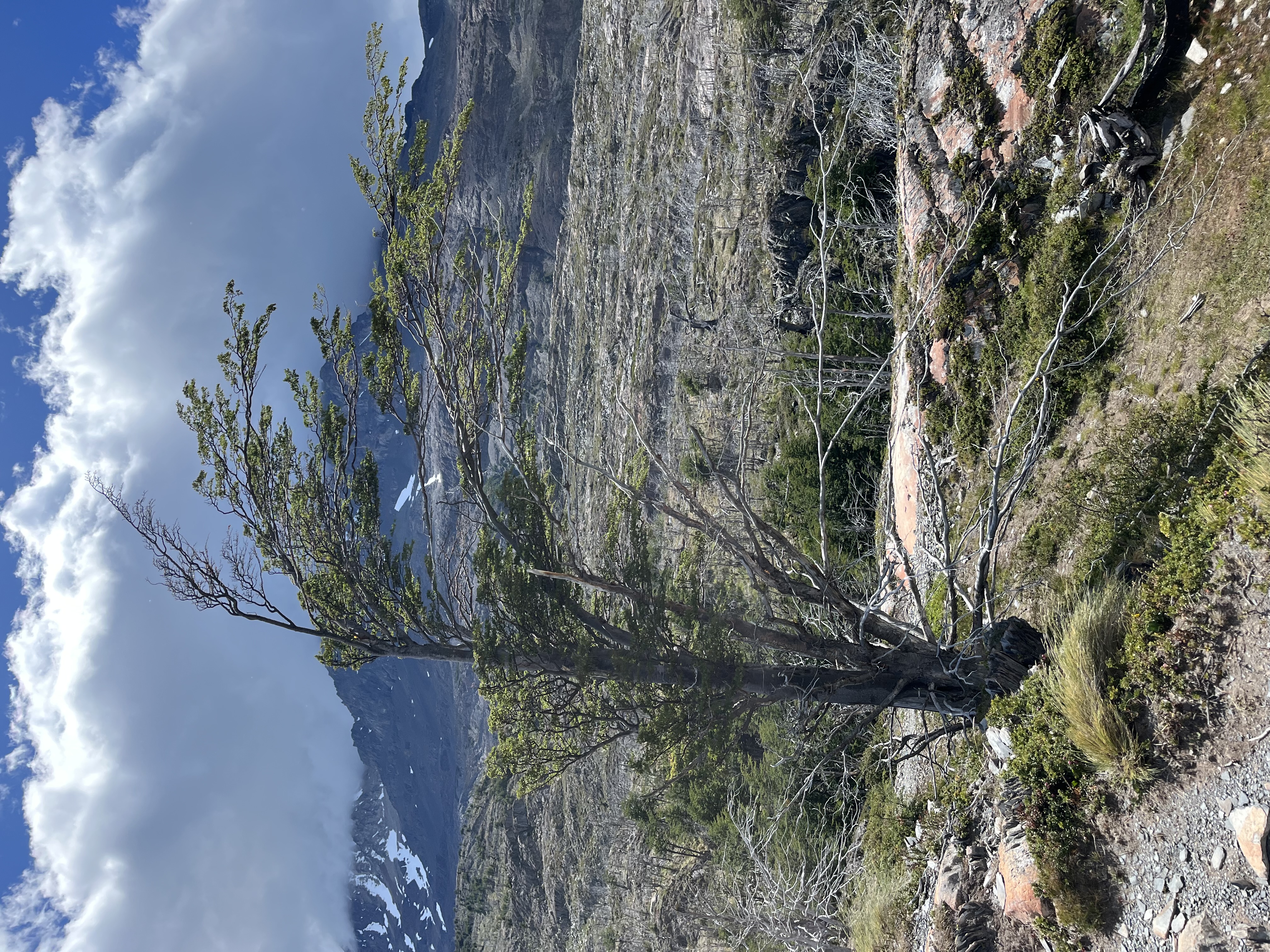 Der Weihnachtstag war wieder ruhig, nur noch 11 km bis Paine Grande in leicht hügeligem Gelände. Haben wir schon erwähnt, dass es in Patagonien sehr windig ist? Dies war vielleicht der windigste Tag, den wir erlebten, und viele der Bäume hier hatten den Kampf gegen den Wind bereits aufgegeben, als sie heranwuchsen.