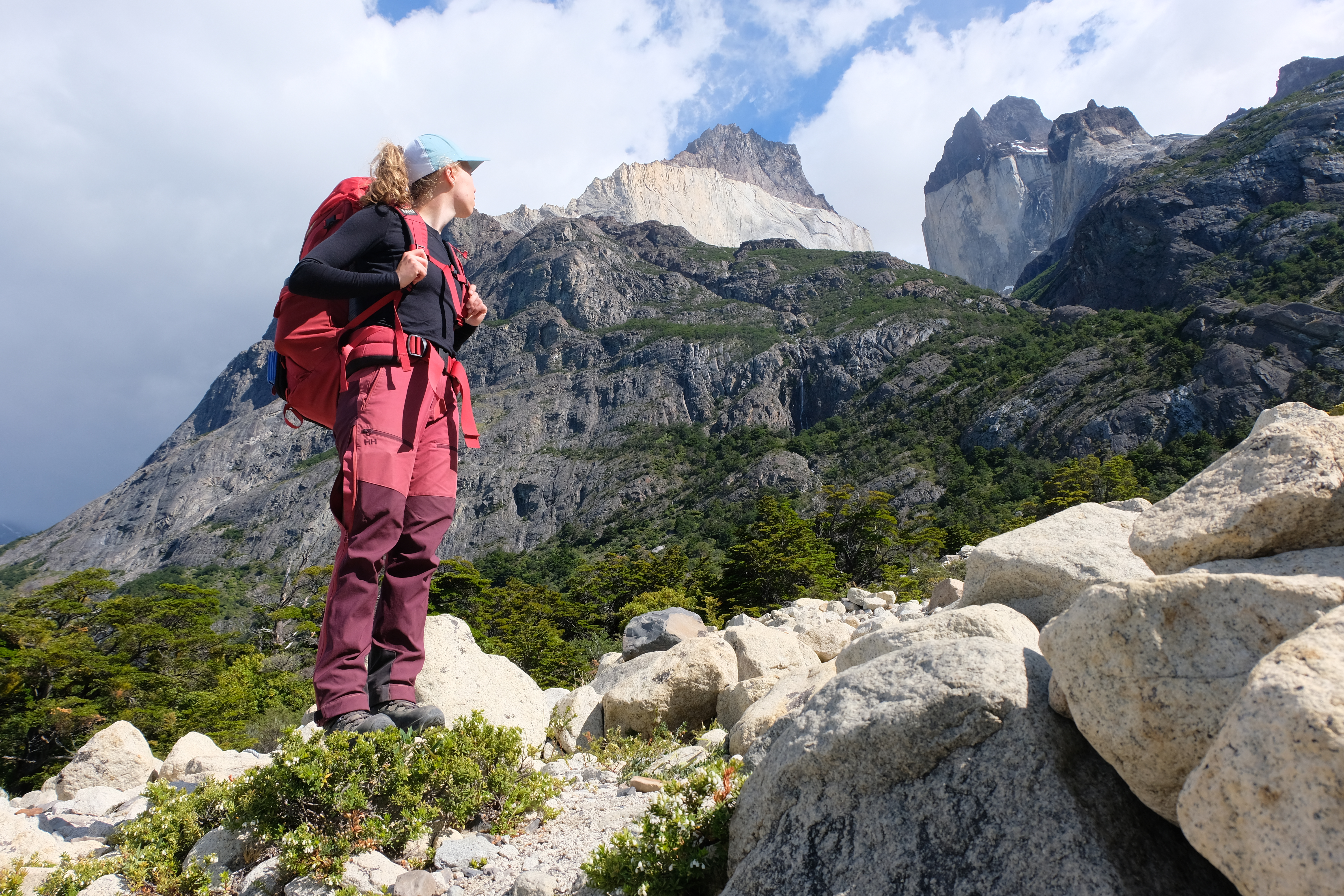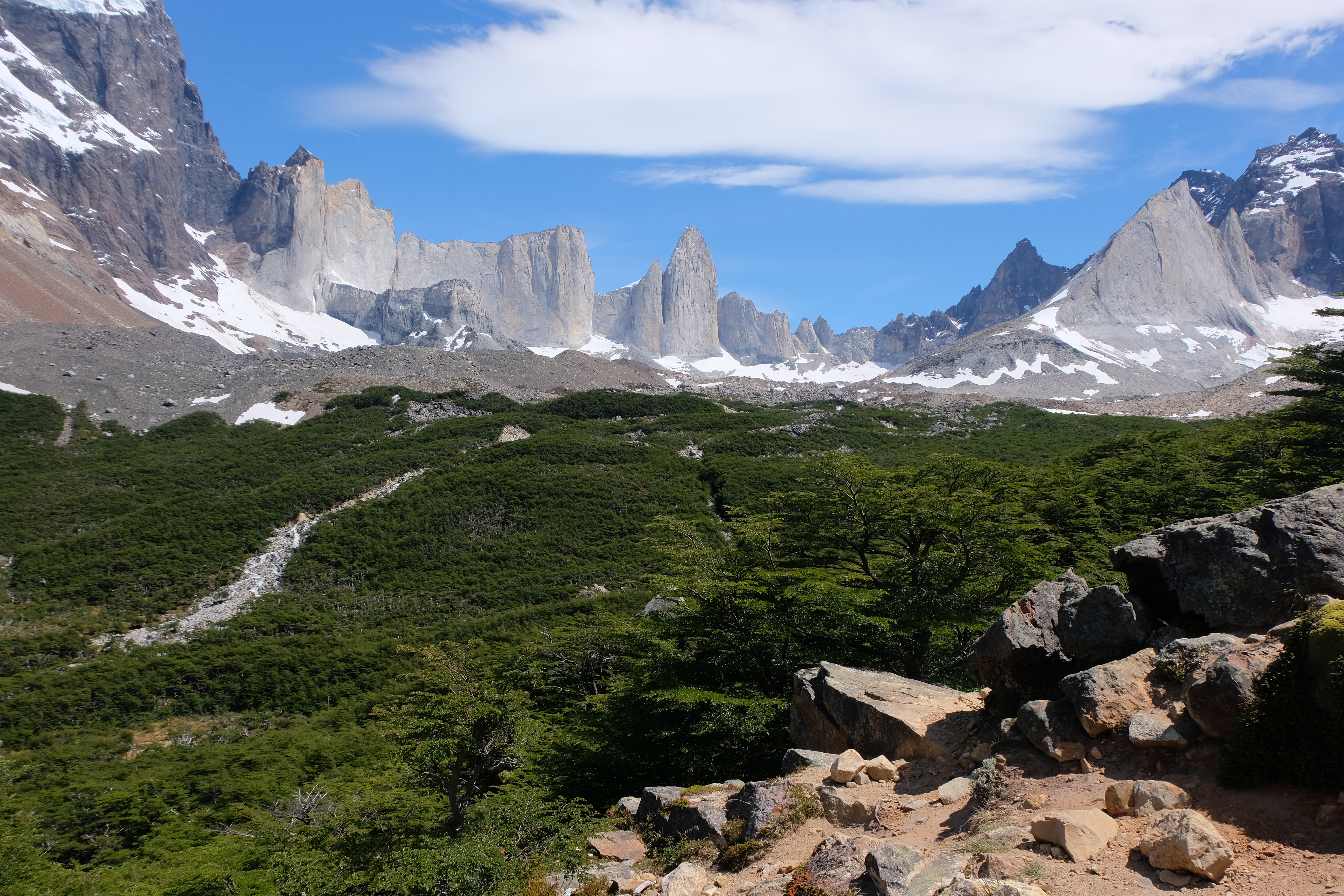 Anschließend beendeten wir die Tour mit einem Aufstieg zum Aussichtspunkt der Touristenattraktion Las Torres selbst, den drei ikonischen Speerspitzen auf ca. 2800 m.ü.M. Um es in die richtige Perspektive zu rücken: Der Aussichtspunkt lag auf etwa 900 und der Zeltplatz, von dem aus wir starteten, auf etwa 200. Der Weg durch das Tal war leider ziemlich langweilig, zumindest im Vergleich zu was wir bereits gesehen hatten, aber im Laufe des Tages wurde der Weg trotzdem von Tagesausflüglern geflutet.