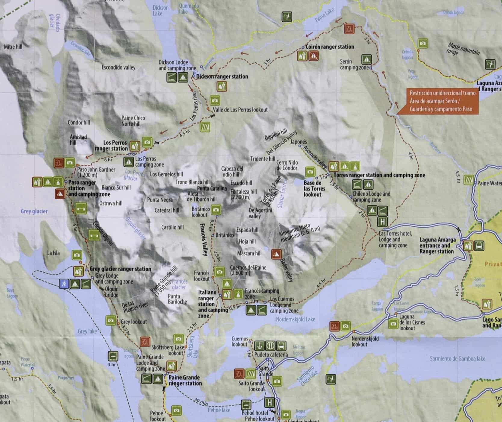 Kart over Torres del Paine.